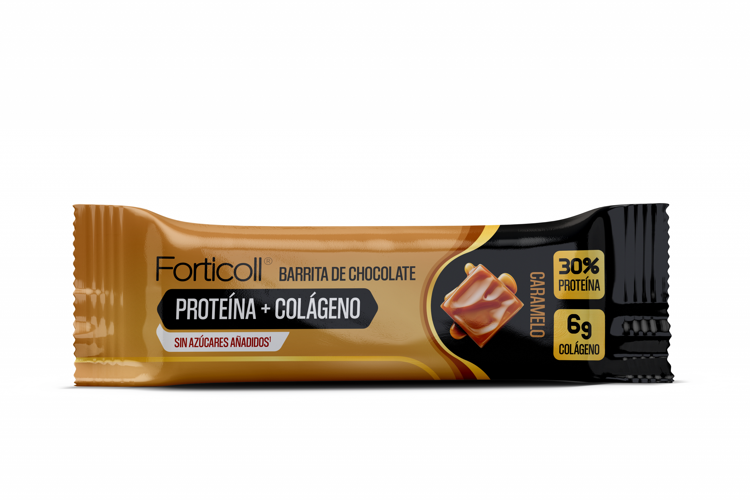Barrita de proteína con colágeno sabor caramelo sin azúcares añadidos.
