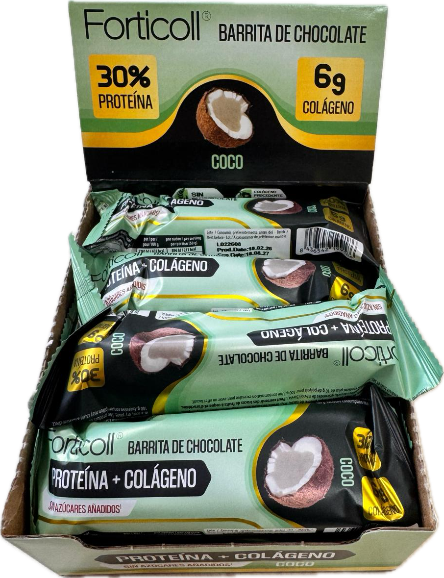 Barrita de proteína con colágeno sabor coco sin azúcares añadidos.