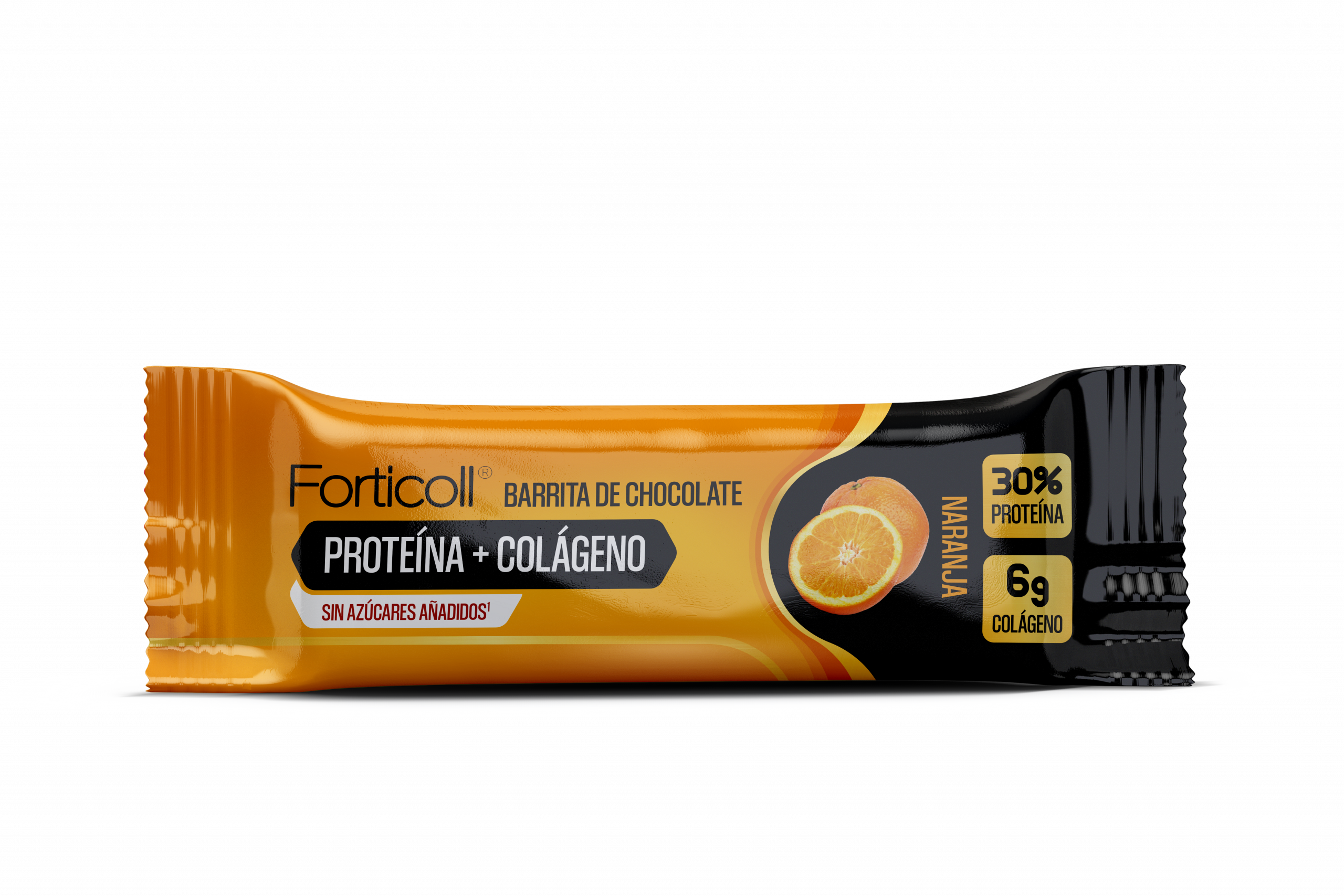 Barrita de proteína de colágeno sabor naranja sin azúcares añadidos.