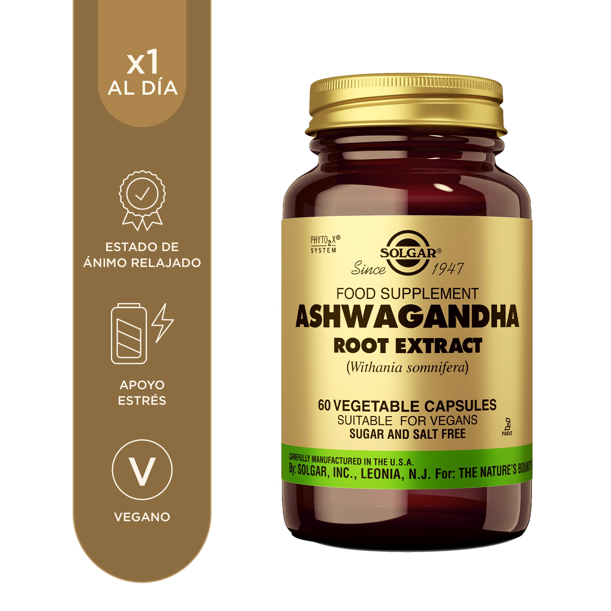 La ashwagandha (Withania somnífera) es una planta que tiene propiedades adaptogénicas y contribuye a mantener un estado de ánimo tranquilo y relajado. Esta planta se ha utilizado durante miles de años en la cultura india y unani y se le conoce con el nombre de “ginseng indio”. Contiene la patente PhytO2X®, una mezcla especial de antioxidantes naturales, cuyo propósito es mantener la frescura de los ingredientes. Los productos herbales de Solgar® con Potencia Total Estandarizada (SFP) como lo es este, se elaboran mediante un procedimiento exclusivo que combina las corrientes de la fitoterapia tradicional y la tecnología herbaria. Esta mezcla de ciencia y tradición crea un extracto herbario de alta calidad con las cualidades beneficiosas de todos los componentes que se encuentran en la planta.
