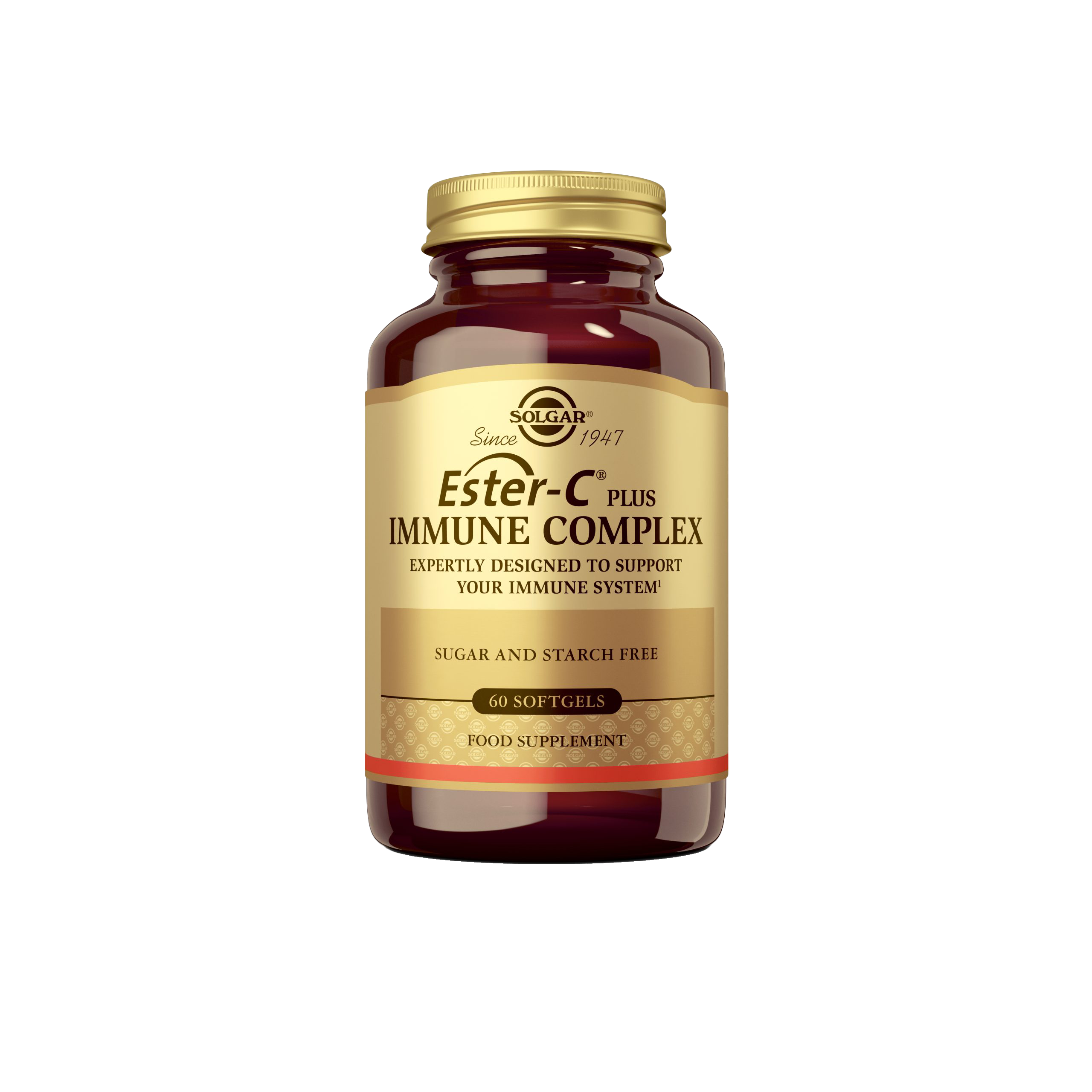 Ester-C® Plus Inmune Complex de Solgar® contiene nutrientes científicamente estudiados que apoyan el sistema inmunitario durante todo el año. Esta fórmula combina nutrientes como las vitaminas A, B6, B12, C, D3, y ácido fólico junto con el mineral zinc. También aporta los ingredientes botánicos saúco, equinácea y astrágalo, que tienen una larga historia de uso. Ester-C® está formulado exclusivamente para Solgar® y proporciona una vitamina C patentada, no ácida, ampliamente investigada, que es suave para el estómago. Una vez tomado, Ester-C® se retiene en los glóbulos blancos hasta por veinticuatro horas.