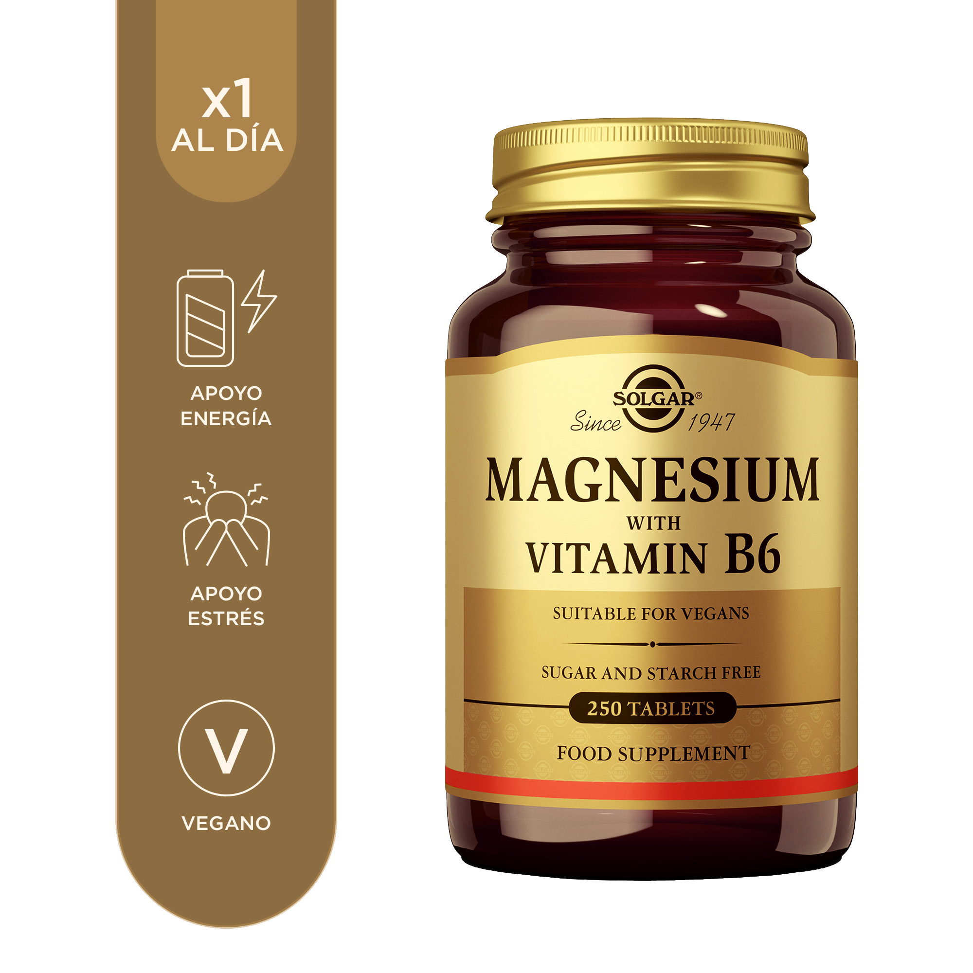 El producto Magnesio con Vitamina B6 de Solgar® es una combinación que aporta diferentes beneficios para el bienestar general. Por su contenido en vitamina B6 ayuda a regular la actividad hormonal en situaciones donde puede encontrarse alterada, mientras que su acción conjunta con el magnesio contribuye a reducir el cansancio y la fatiga y a una función psicológica normal.