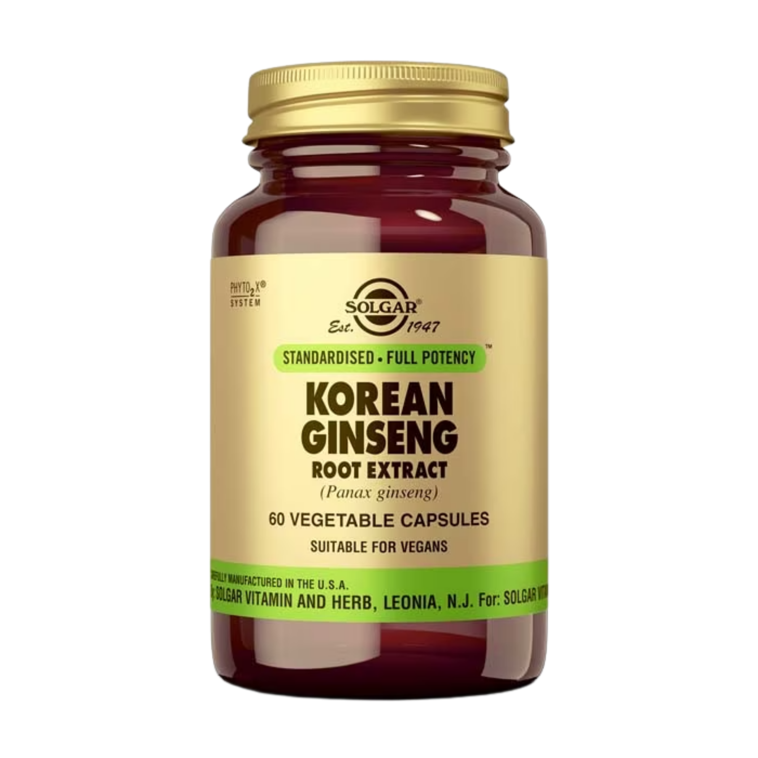 El ginseng es un género de plantas que reúne diferentes especies y que tradicionalmente han sido catalogadas como plantas adaptógenas. En la medicina tradicional china se denomina ginseng a la especie Panax ginseng. Esta planta es originaria de Corea, Rusia y China, donde se encuentra protegida. Las raíces de esta planta perenne de crecimiento lento son muy valoradas, principalmente las que tienen mas años, pues presentan mayor cantidad de principios activos. Panax ginseng también se conoce como ginseng coreano, ginseng rojo o ginseng asiático. Ginseng Coreano de Solgar® contiene raíz de ginseng (Panax ginseng) en polvo y extracto pulverizado 4:1 de raíz.