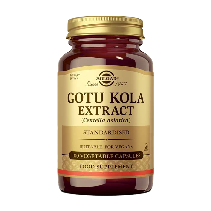El extracto estandarizado de Gotu Kola (Centella asiática) de Solgar® es uno de nuestros extractos herbales de alta calidad. Aporta 100 mg de extracto estandarizado de Gotu kola (partes aéreas) (con 6 mg de glucósidos triterpénicos) por cápsula vegetal. Gotu kola (Centella asiática) es una planta trepadora perenne que pertenece a la familia del perejil. En nuestros extractos herbales estandarizados, los principios activos siempre tienen la misma concentración, no cambia de un envase a otro. Este producto contiene PhytO2X, una combinación especial de antioxidantes naturales para mantener la frescura de los ingredientes.