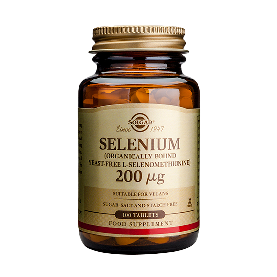 El selenio es un micronutriente esencial implicado en diferentes procesos biológicos que desempeña diversas funciones en el organismo. El selenio es importante para la formación de espermatozoides, la función de la glándula tiroidea, la salud del cabello y las uñas, el sistema inmune y la protección frente al daño causado por los radicales libres. El selenio se encuentra naturalmente presente en muchos alimentos, como carne de aves, huevos, marisco, pan y cereales… aunque su contenido en selenio dependerá del contenido en selenio de los suelos donde se cultivaron las plantas que sirven de alimento a los animales o se emplean en la elaboración de los alimentos. La seleniometionina es una forma orgánica de selenio en la que la estructura del aminoácido metionina dispone de un átomo de selenio en lugar de un átomo de azufre. Esta característica permite que esta fuente de selenio disponga de una alta biodisponibilidad. Habitualmente la seleniometionina se obtiene mediante procesos de fermentación de levadura en medios enriquecidos con selenio. La levadura fija en su interior el selenio en forma de seleniometionina. Esta levadura puede emplearse directamenteen la elaboración de los productos, o bien separar la seleniometionina del resto de la levadura. Selenio 200 µg de Solgar® aporta 200 µg de selenio elemental por comprimido en forma de seleniometionina, sin levadura.