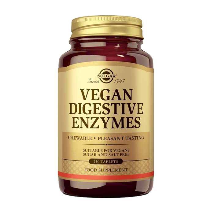 Vegan Enzimas Digestivas de Solgar® es una mezcla de enzimas digestivas vegetales que actúa sobre los diferentes grupos de nutrientes favoreciendo su degradación. Contiene lipasa, amilasa, proteasa, amiloglucosidasa y celulasa, para favorecer el metabolismo de carbohidratos, grasas, proteínas y fibra vegetal, altamente presente en dietas vegetarianas y veganas. La actividad enzimática de Vegan Enzimas Digestivas de Solgar® se mide según el estándar Food Chemical Codex, estándar de calidad internacionalmente reconocido, y el producto se presenta en forma de comprimidos masticables de agradable sabor sencillos de tomar.