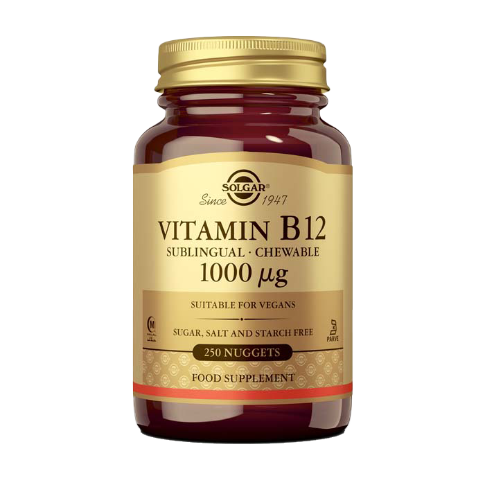 Vitamina B12 en comprimidos sublinguales-masticables de Solgar® aporta, por comprimido, 1000 μg de la forma de vitamina B12 cianocobalamina. Entre otras funciones, la vitamina B12 interviene en la producción de energía a partir de los alimentos, en el funcionamiento del sistema inmunitario y el sistema nervioso y en la formación de glóbulos rojos. La vitamina B12, una vitamina hidrosoluble, se encuentra de forma natural en los alimentos de origen animal, como el pescado, la carne, productos lácteos y huevos. Este nutriente no puede ser producido por el organismo y debe ser ingerido a través de la dieta. Por ello, es especialmente interesante en aquellas situaciones en la que su absorción está disminuida o para personas que siguen una dieta restringida en este nutriente, como la dieta vegana.