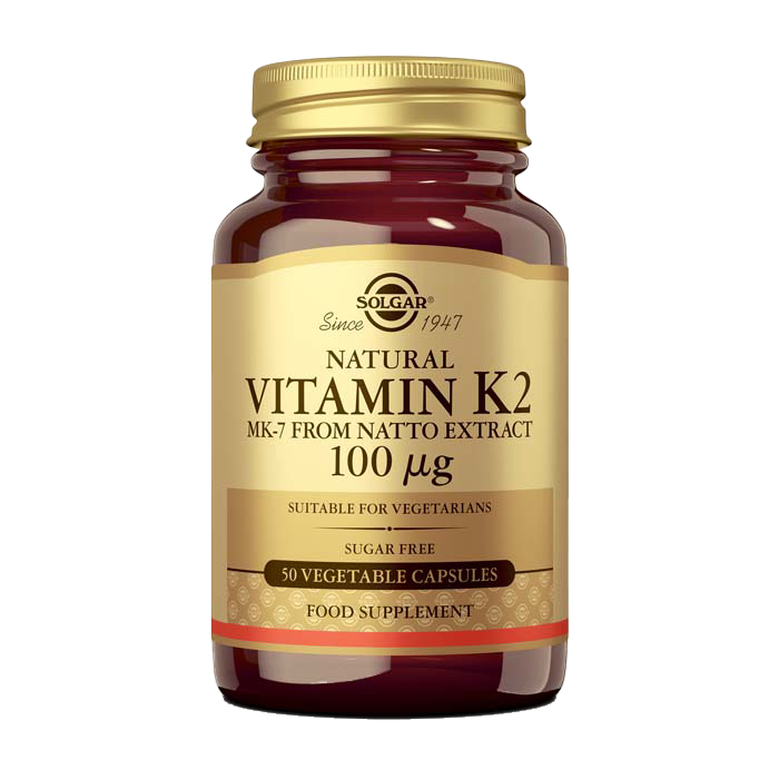 Bajo en nombre de vitamina K se agrupan tres compuestos diferentes. La vitamina K1 (fitomenadiona), que se obtiene de los alimentos, la vitamina K2 (menaquinona) que la producen las bacterias, y la vitamina K3 (menadiona), una forma sintética de vitamina K. La vitamina K2 incluye un rango de formas de vitamina K referidas como menaquinonas-n (MK-n) destacando por su mayor biodisponibilidad la menaquinona-7 (MK-7). La vitamina K2 está presente en alimentos de origen animal y en productos fermentados como el queso y el natto, un producto fermentado que se obtiene de la soja y una de las fuentes más ricas de vitamina K2 en forma de MK-7. La vitamina K juega un importante papel en la coagulación de la sangre y también es importante en la salud ósea, pues interviene en los procesos de fijación de calcio en el hueso. Mientras que la vitamina K1 suele asociarse preferentemente con su actividad sobre la coagulación de la sangre, la vitamina K2 se relaciona con su actividad de fijación de calcio a nivel óseo. La Vitamina K2 con MK-7 natural (extracto de natto) de Solgar® proporciona por cápsulas 100 microgramos de esta forma de vitamina K2.